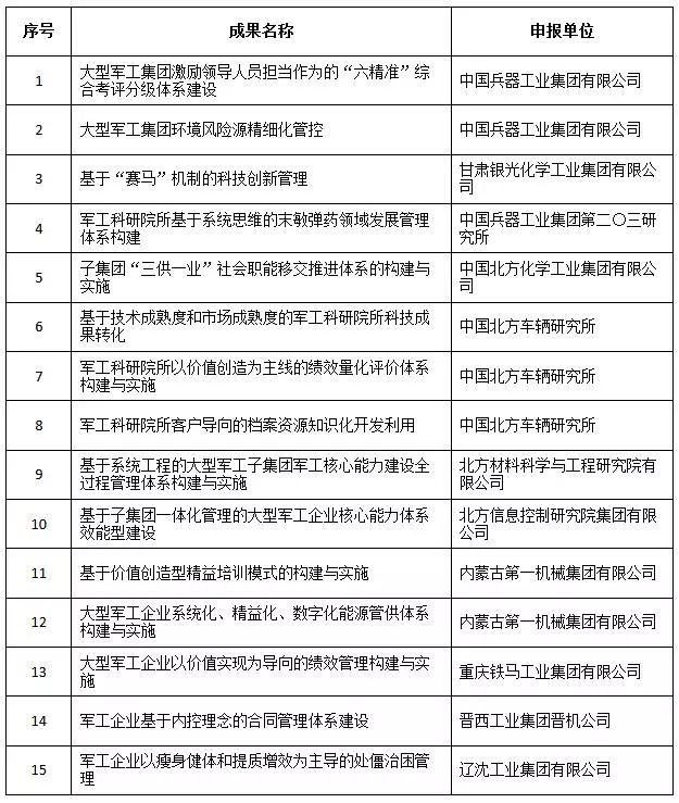 近日,中國兵器工業集團4項創新成果獲全國企業管理現代化創新成果獎、42項創新成果獲國防科技工業企業管理創新成果獎。 全國企業管理現代化創新成果 經全國企業管理現代化創新成果審定委員會終審,第二十五屆全國企業管理現代化創新成果公布,中國兵器工業集團4項創新成果榮獲二等獎。 二等獎 國防科技工業企業管理創新成果 2018年度國防科技工業企業管理創新獲獎成果名單發布,中國兵器工業集團共獲獎42項,其中:一等獎7項,二等獎15項,三等獎20項。獲獎總量及一等獎數量均位于軍工集團首位。 一等獎 二等獎 三等獎 據悉,2018年度的國防科技工業企業管理創新評審工作,經專家初審、函審、一等獎候選成果答辯、專家會議評審、評審委員會審核并公示后,評選出一批在履行強軍首責、全面貫徹創新驅動發展戰略和全面深化改革、高質量發展等方面的優秀成果。本年度共確定獲獎成果307項,其中一等獎44項,二等獎126項,三等獎137項。 |